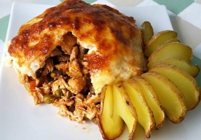 - Вземете огнеупорна купа, покрийте я с два листа кори за баница, напълнете с плънка, завийте от края.