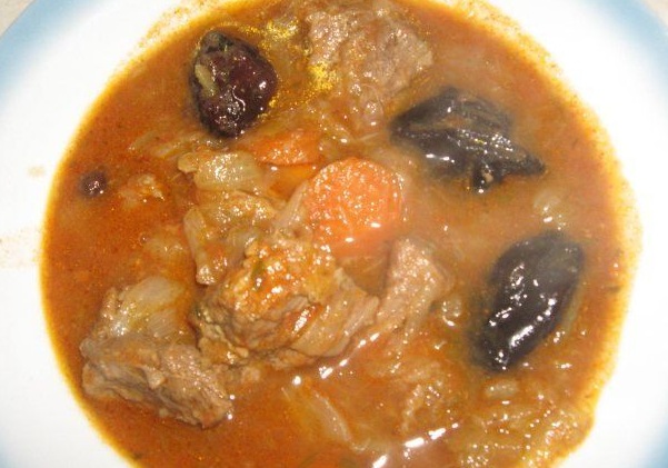 - Към края на готвенето се прибавят сините сливи и брашното размито в малко вода.
