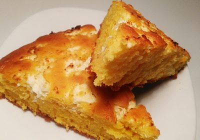 - Разбиваме яйцата, прибавяме последователно, олиото, гриcта, киселото мляко, брашното, бакпулвера, солта и захарта, разбъркваме добре изсипваме в тава.