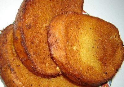 - Нарязаните филийки хляб се потапят, докато се напоят добре и след това се изпържват от двете страни в сгорещено олио.
