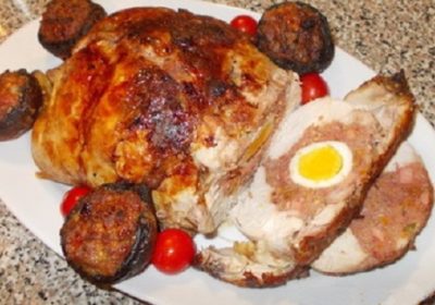 Сложете в средата двете сварени яйца и сгънете пилето и го зашийте.
